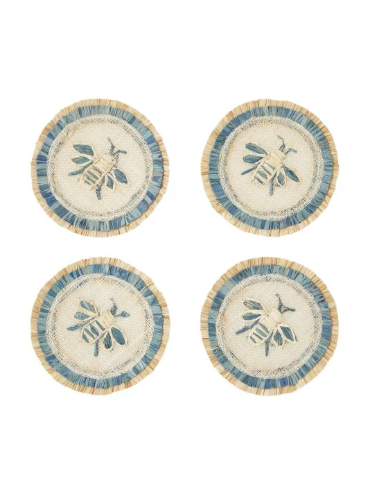 Perfect for summer soirées, these straw coasters are hand embroidered with Joanna Bunchanan’s signature bee.
