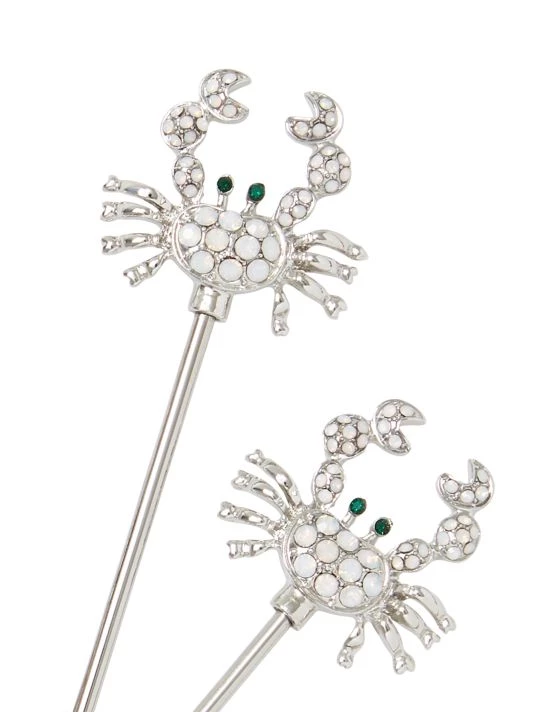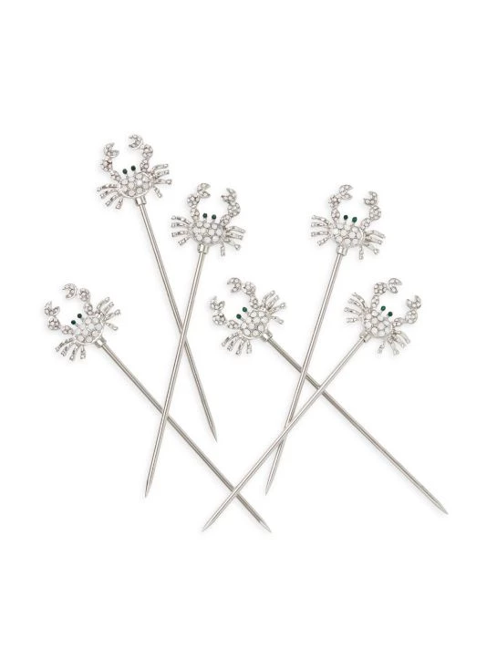 Polka dot enameled crabs top this playful four-piece cocktail stick set.