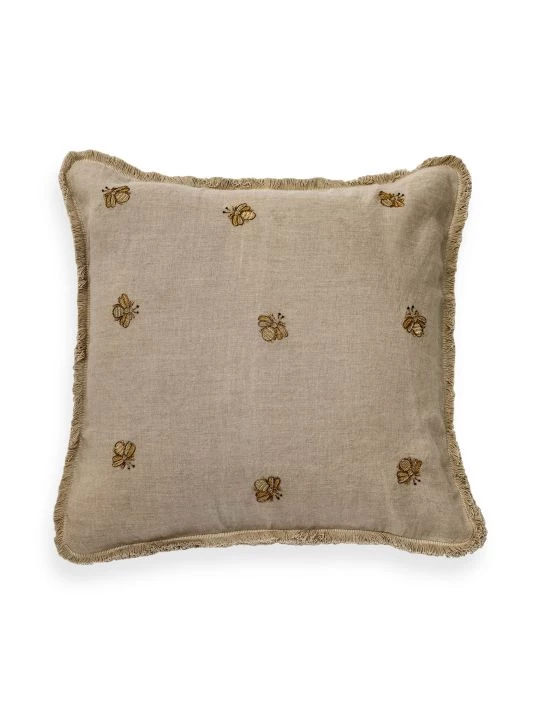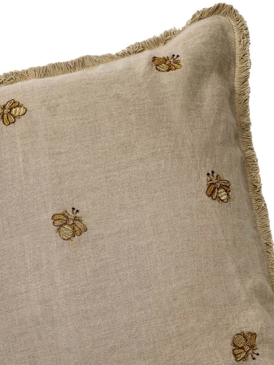Hand-embroidered bees cover this decorative linen throw pillow, designed with soft fringed trim.