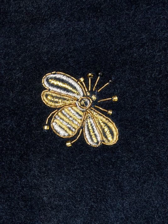 Hand-embroidered bees cover this decorative velvet lumbar pillow, designed with contrast fringed trim.
