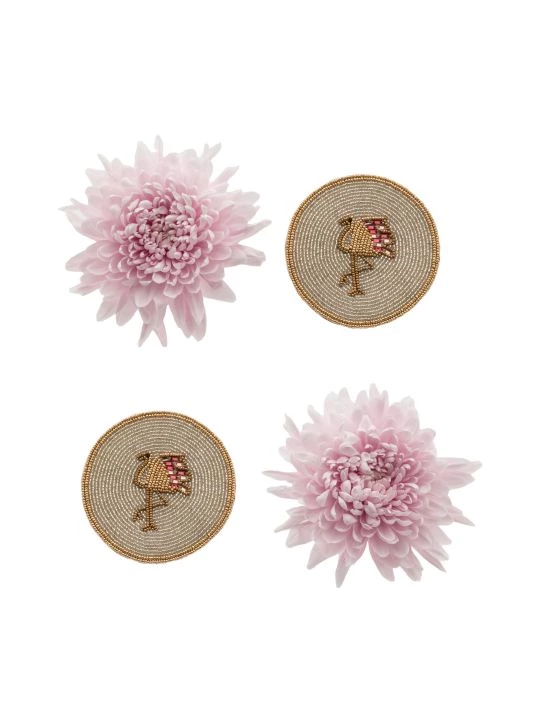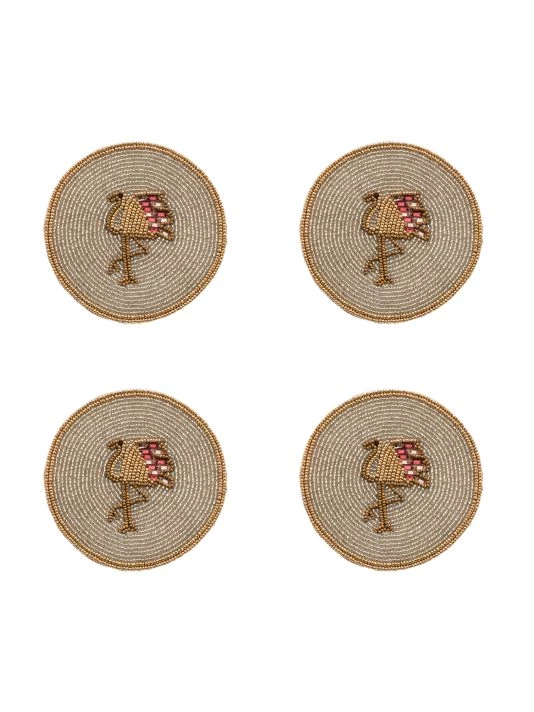 Beaded by hand, this stylish coaster set features an intricate flamingo motif and contrast striped trim.