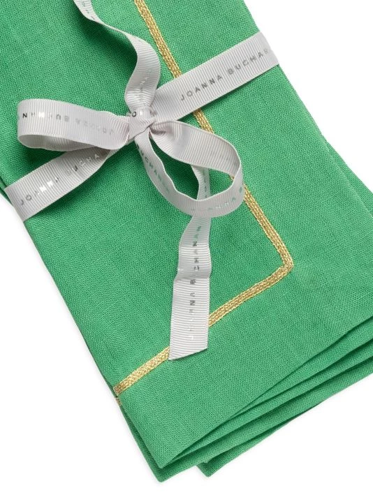 From The Gold Trim Linen Dinner Napkins Collection. JOANNA BUCHANAN’s tropical linen napkins feature a glittery gold stripe at the trim.