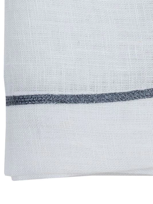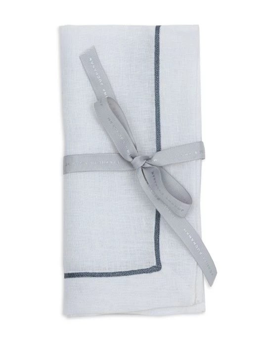 A glittery gunmetal stripe embellishes this stylish linen napkin set, lending festive flair to the classic look.