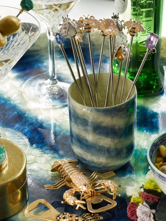 These jeweled cocktail picks are adorned with glass gems, adding a playful sparkle to cocktails.