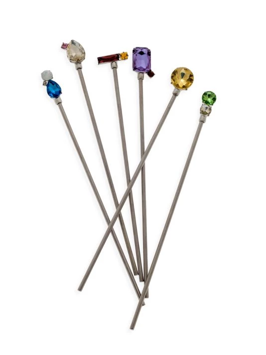 Crafted of food-grade stainless steel, these swizzle sticks are topped with jewel-toned gems, adding a dazzling pop of color to drinks.