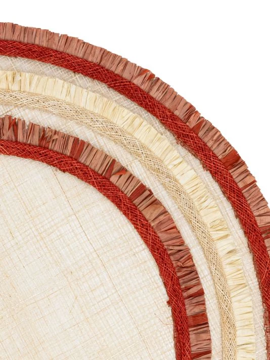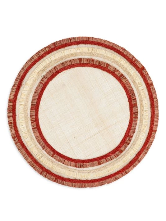 Contrast stripes and a ruffle edge add textural style to this woven straw placemat.