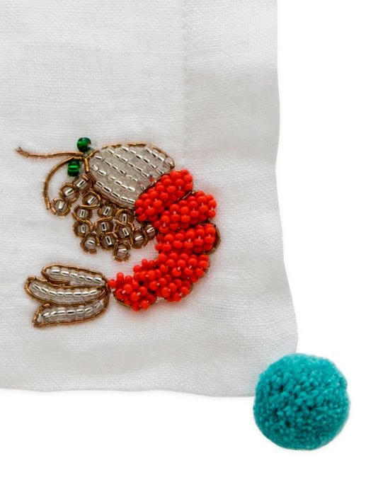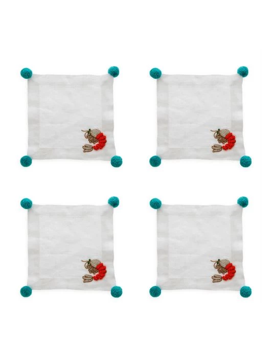 A beaded lobster embellishes this linen cocktail napkin set, framed by vibrant contrast pom-poms.