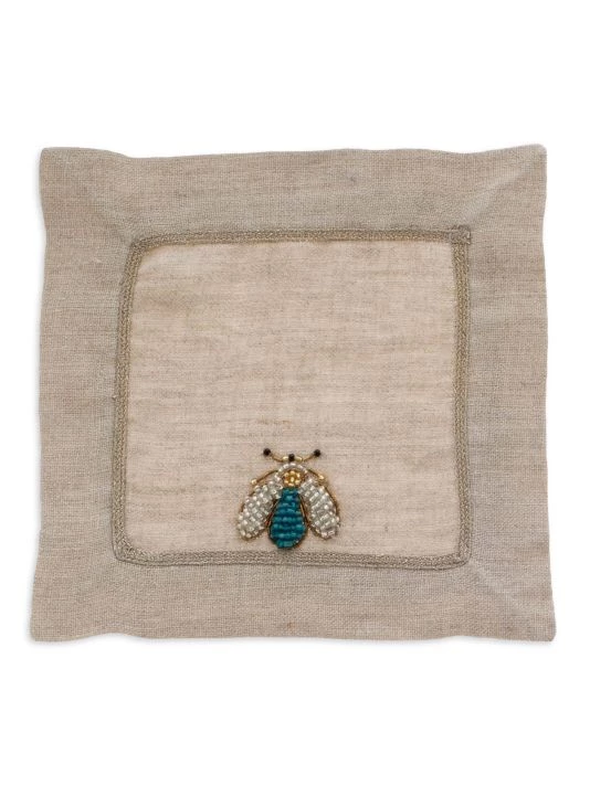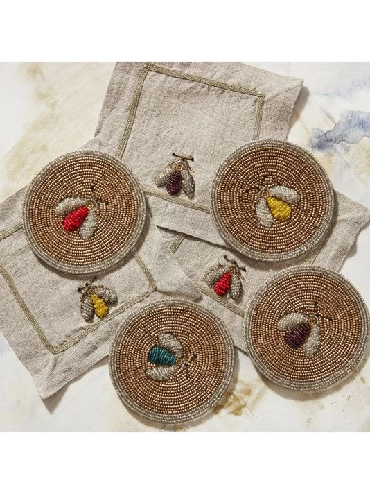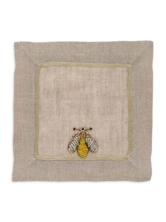Crafted of 100% linen, these cocktail napkins are embellished with glass-beaded bees and metallic trim.