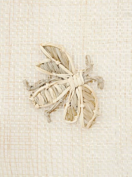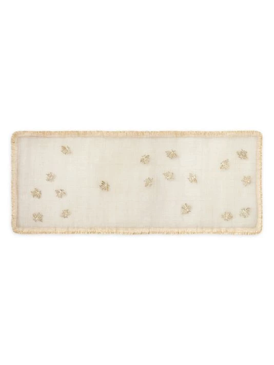 Woven from abaca fibers, this gorgeous table runner is adorned with hand-embroidered bees and a fun double fringe at the edge.
