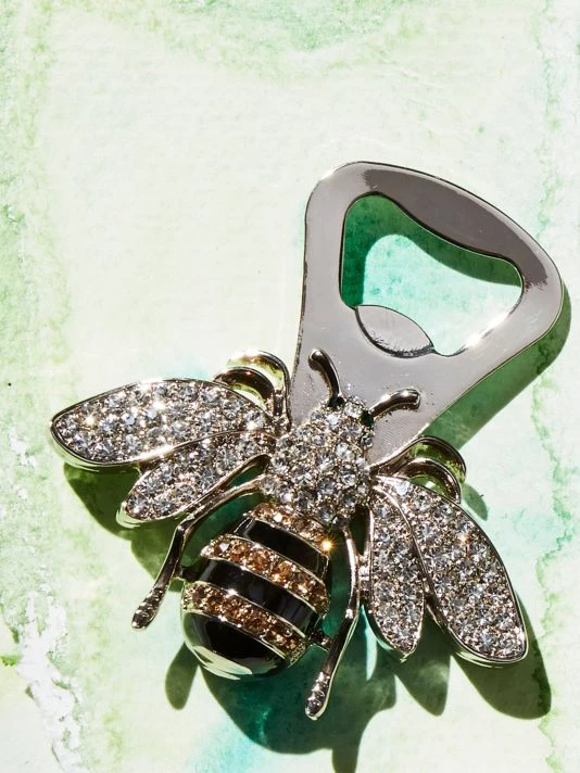 Allover crystals lend shine to this glamorous bottle opener, crafted as a glittering striped bee.