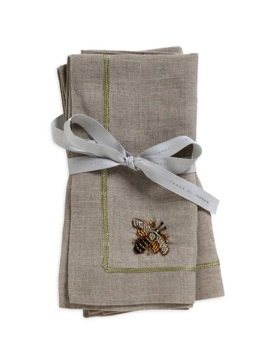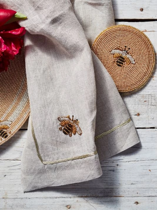 These flax linen dinner napkins are adorned with the brand’s signature stripey bee and finished with a contrast metallic trim.
