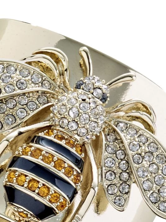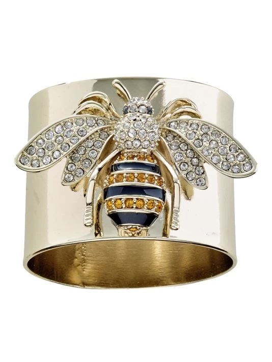 A crystal and enamel bee adds glittering shine to this polished goldtone napkin ring, designed with bold striped patterning.