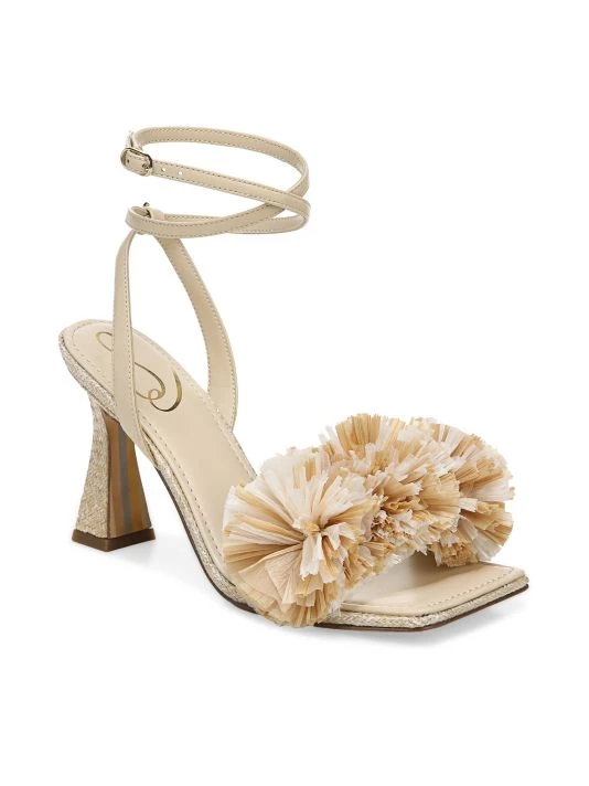 Raffia flowers embellish the strap of these heels, designed with a woven texture.