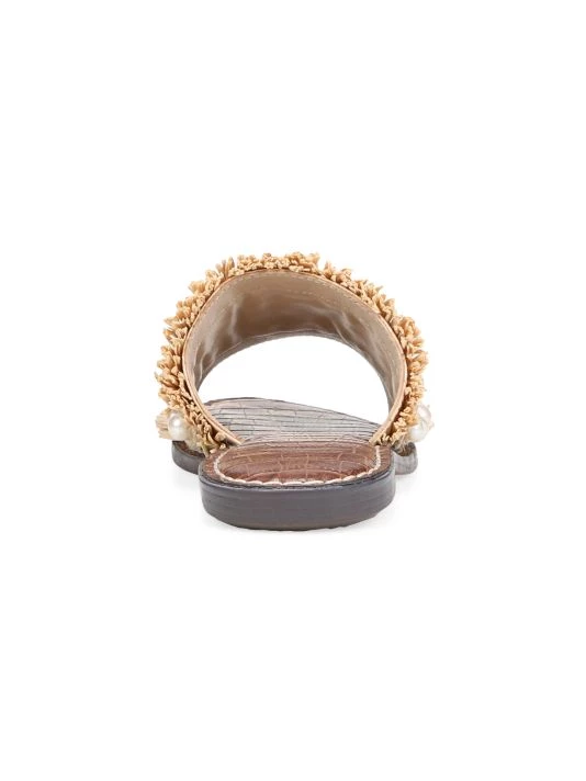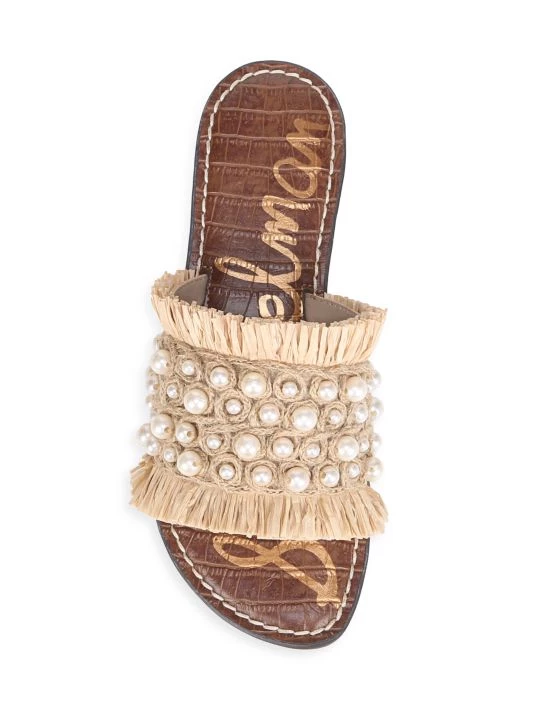 Trimmed with wispy straw, Sam Edelman’s Guthrie sandals feature a woven rope vamp adorned with decorative faux pearls. This slip-on pair is set on a crocodile-embossed leather footbed.