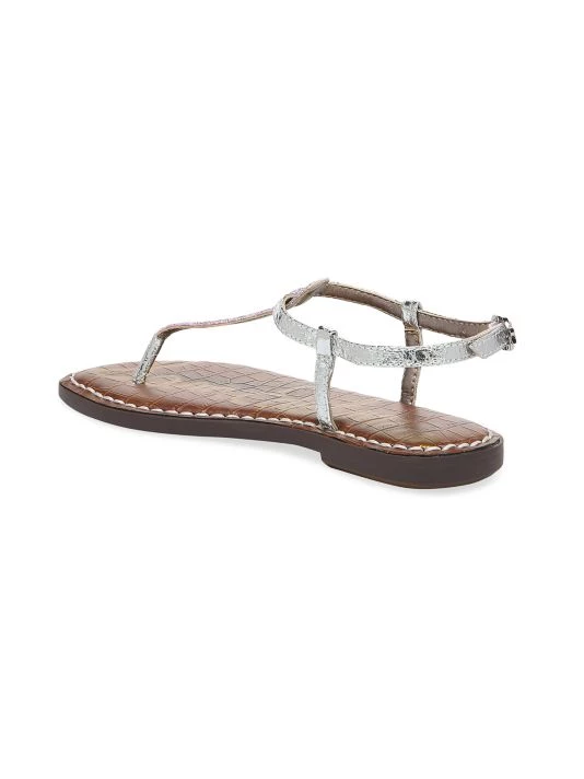 Crafted from metallic faux leather, these sandals have a classic T-strap shape.