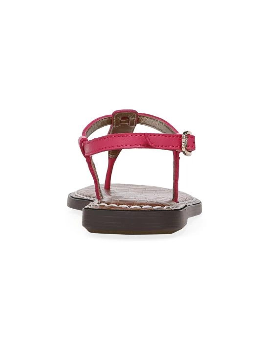 Crafted from bright faux leather, these sandals have a classic T-strap shape.