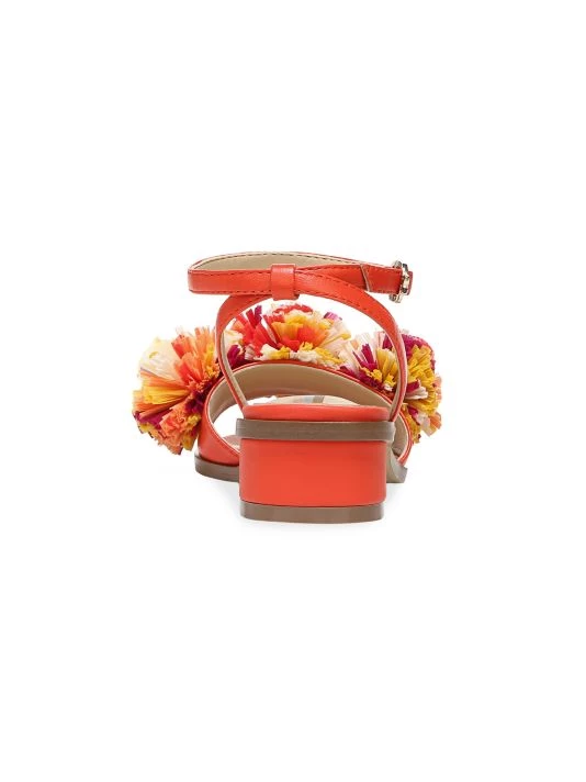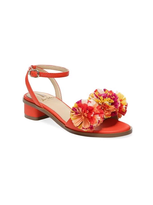 Bright raffia pom-poms embellish these bright sandals, designed with a petite block heel and a wraparound ankle strap.